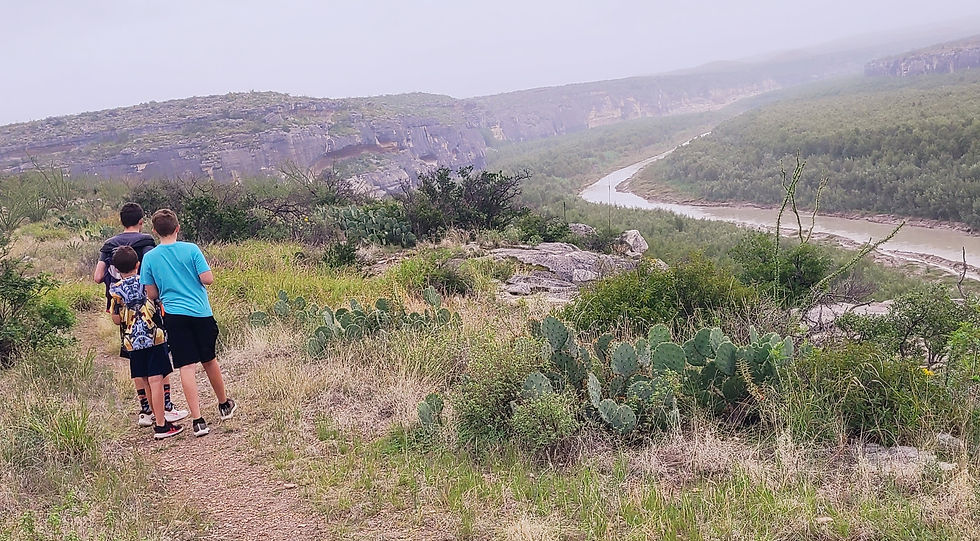 We hiked through the Seminole Canyon State Park in Texas where we went right along the edge of the Rio Grande with Mexico right on the other side. Certainly not the Mexico that we’re familiar with (i.e. infinity pools, pina coladas, and sandy beaches oh my!), but more of a rainy, dreary, fogged-in cliffside. But there were petroglyphs we were able to see through Bear’s binoculars!
